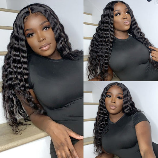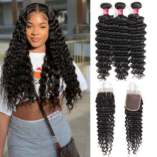 Human Hair Bundles with HD Closure Peruvian Deep Wave Hair 3 Bundles with 4x4 Lace Closure