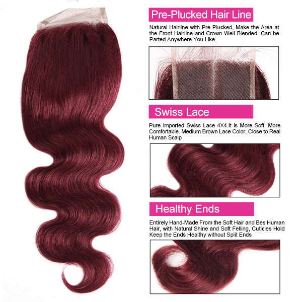 Item: Burgundy Bundles with Closure Body Wave Human Hair 3 Bundles With 4x4 Lace Closure Brazilian Hair
