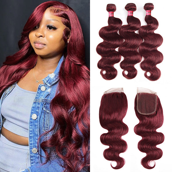 Burgundy Color Body Wave Human Hair 3 Bundles With 4x4 Lace Closure Brazilian Hair