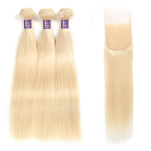 613 Blonde Hair 3 Bundles With Closure Straight Hair 4x4 Lace Closure